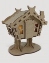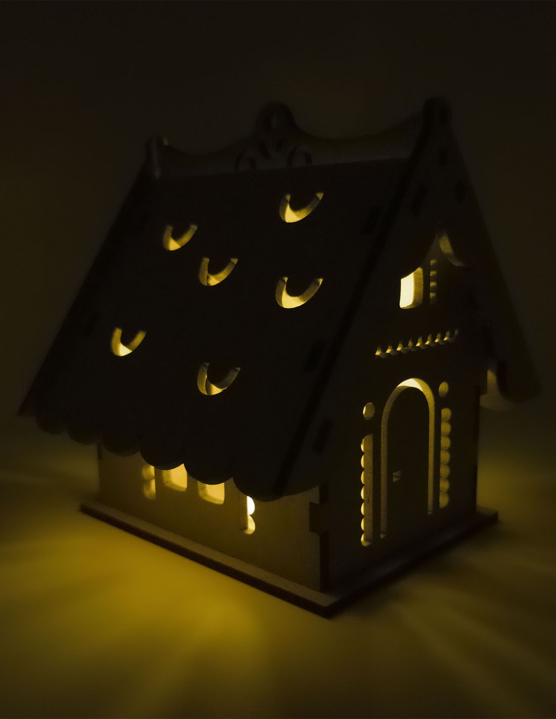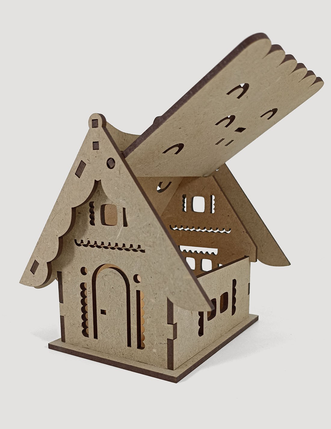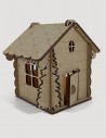 Casita de madera, con tejado a dos aguas, ventanas talladas y con marco en relieve. Tanto la puerta como el tejado se abren. En el interior incluye una vela electrónica que cuando se ilumina crea un ambiente muy acogedor, con la luz saliendo por las ventanas y la puerta.