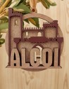Bola de navidad para festeros. El castillo de fiestas de fondo, con el perfil pintado de marrón y al frente Alcoi.Compuesta de 3 capas superpuestas de madera de fibra de 3 mm de espesor.