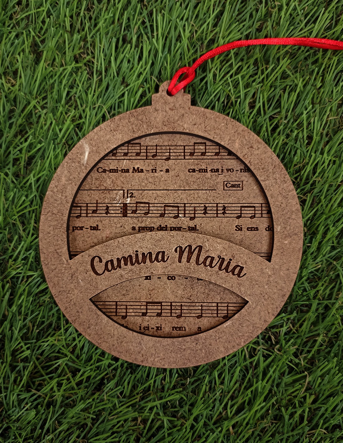 Bola con el villancico CAMINA MARIA.Con forma de bola clásica, redonda. El título del villancico en una capa superior y de fondo la letra grabada.
