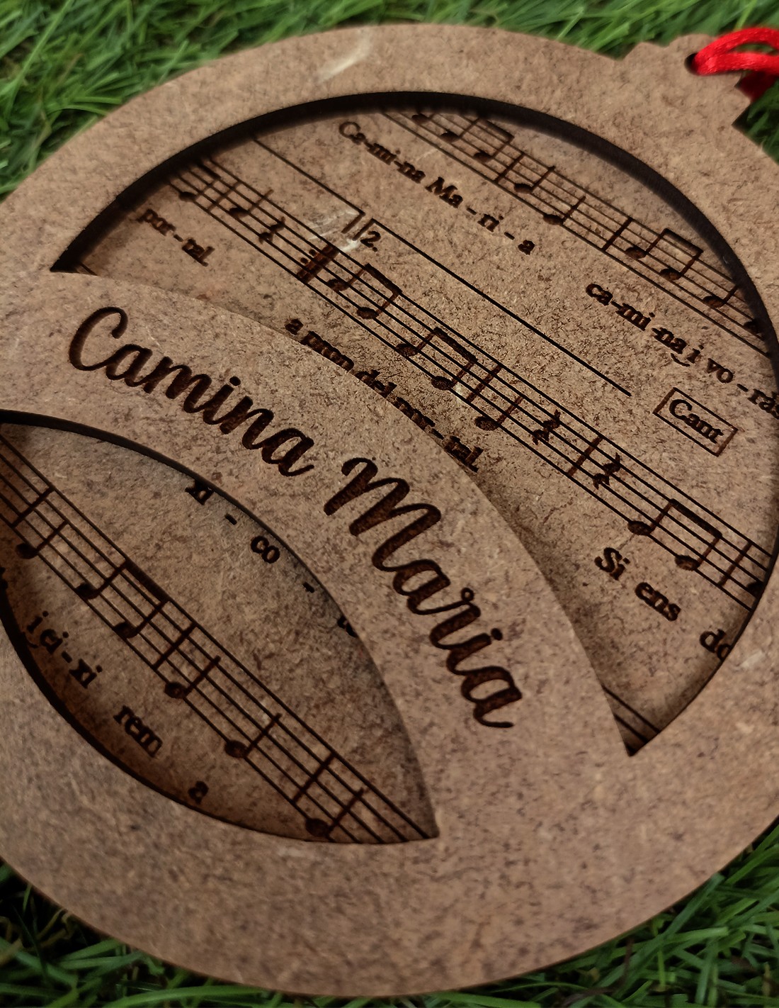 Bola con el villancico A LA RUN RUN.Con forma de casita, el título del villancico en una capa superior pintada de rojo para darle alegría y de fondo la partitura grabada.